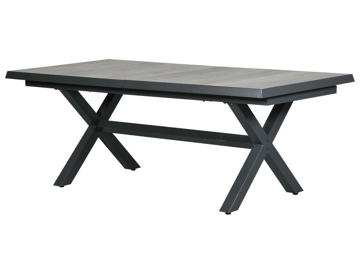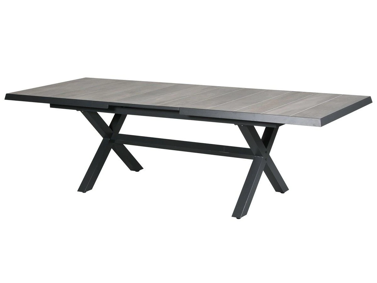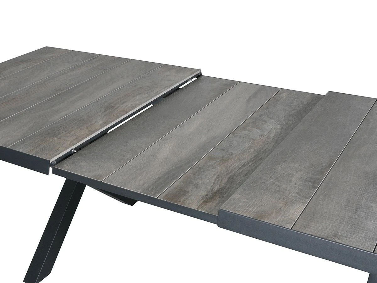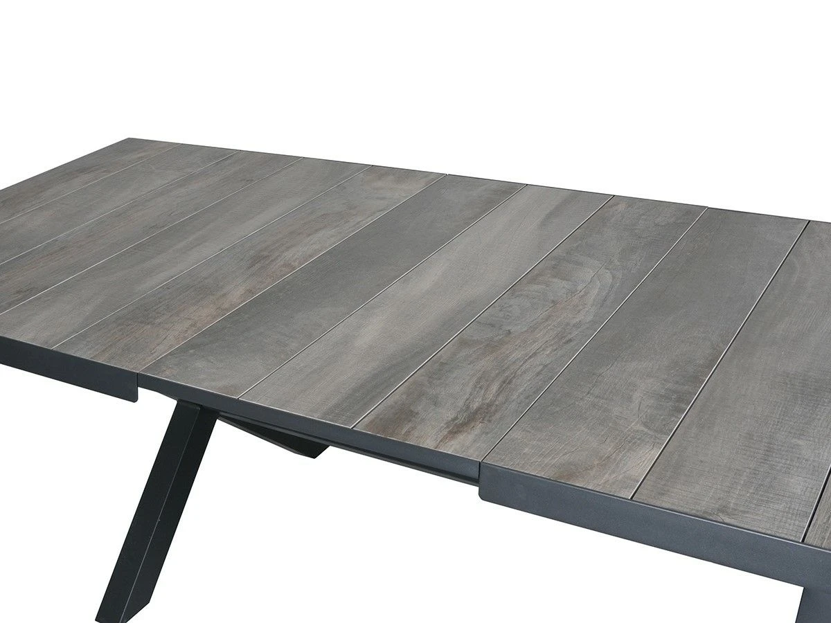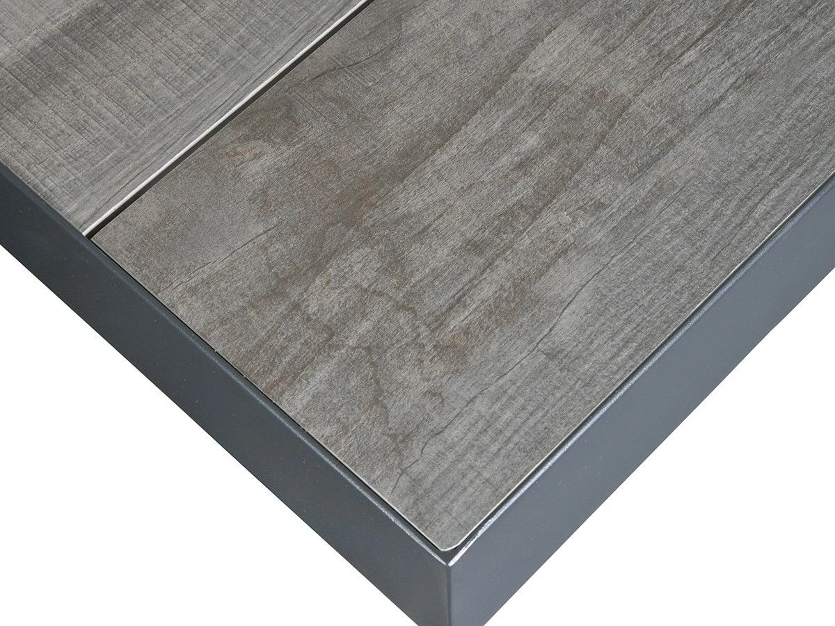 De tafel heeft een stevig frame van aluminium met daarop houtlook tegels van keramiek. De tafel is duurzaam, onderhoudsvriendelijk en weerbestendig. De tafel heeft een hoogte van 78 cm en is strak vormgegeven met een mooie X-poot.