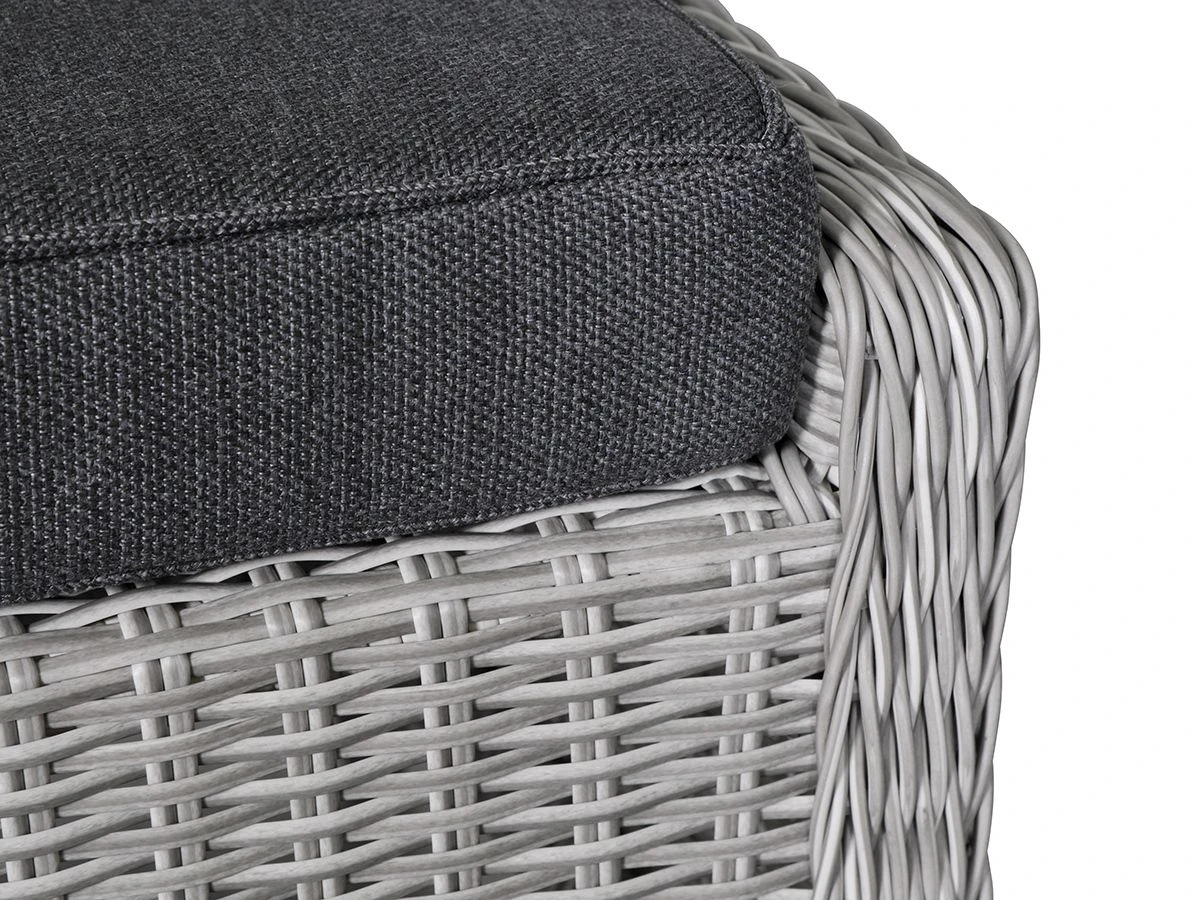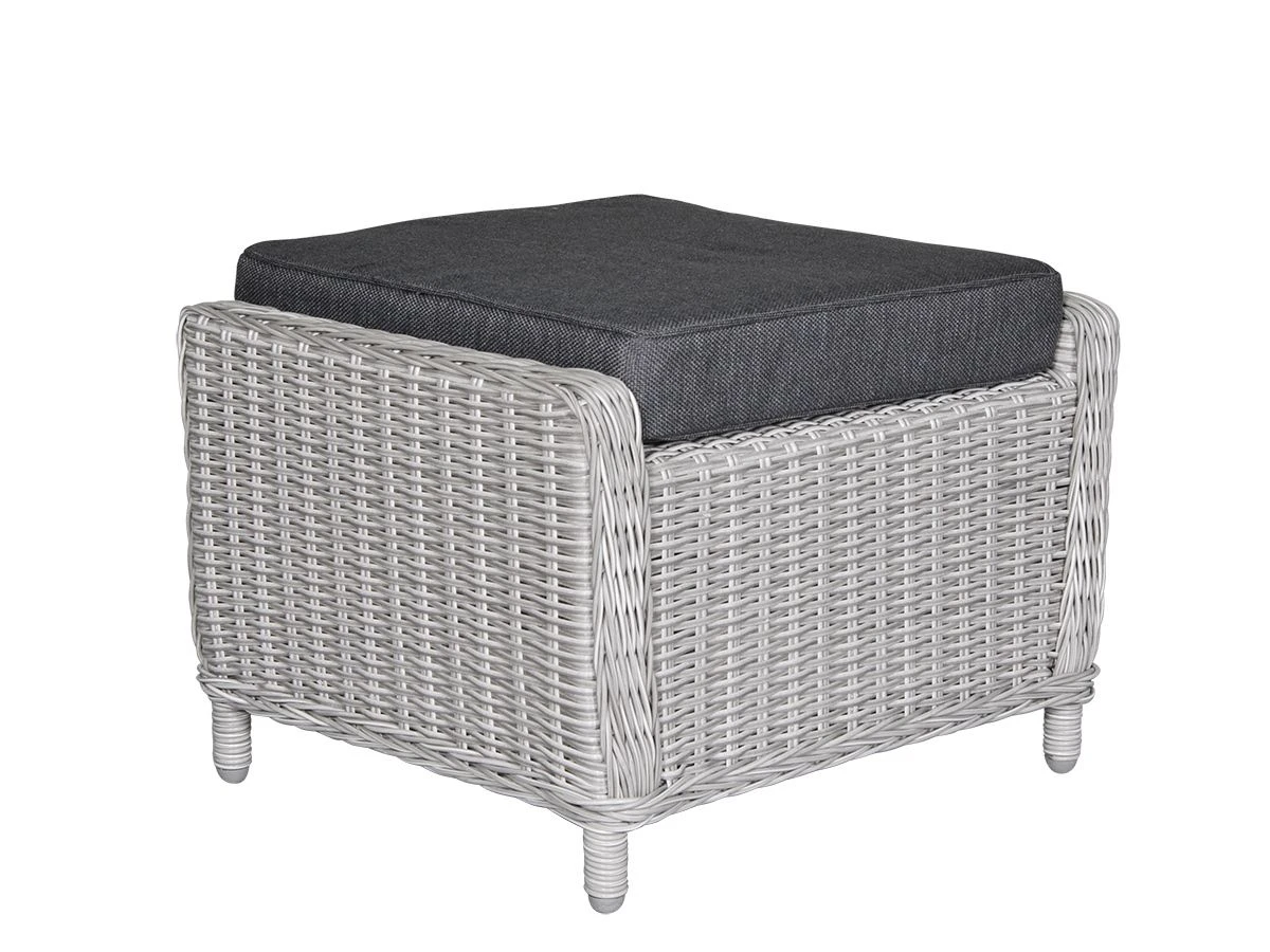 De hocker heeft een aluminium frame met kunststof gevlochten wicker. Het kussen is gemaakt van hoge kwaliteit olefin. Olefin is duurzaam, vuilafstotend en zal niet verkleuren. Het kussen is voorzien van een rits waardoor de hoes met de hand te wassen is.